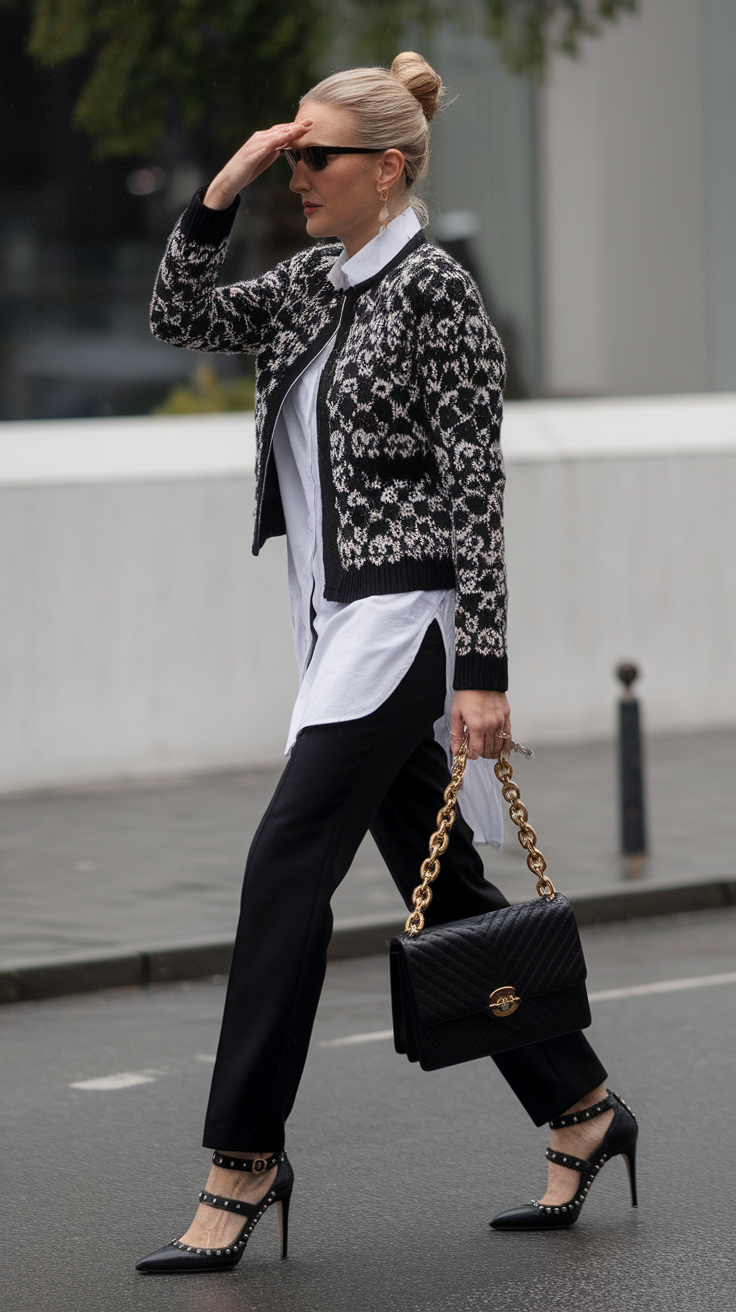 This outfit pairs a black floral-patterned knit jacket over a crisp white shirt with an extended hem. Tailored black trousers and studded black heels create a sleek, polished look, while a quilted black handbag with a bold gold chain adds a touch of luxury. This is a timeless choice for casual outfits women that combines structure and sophistication.