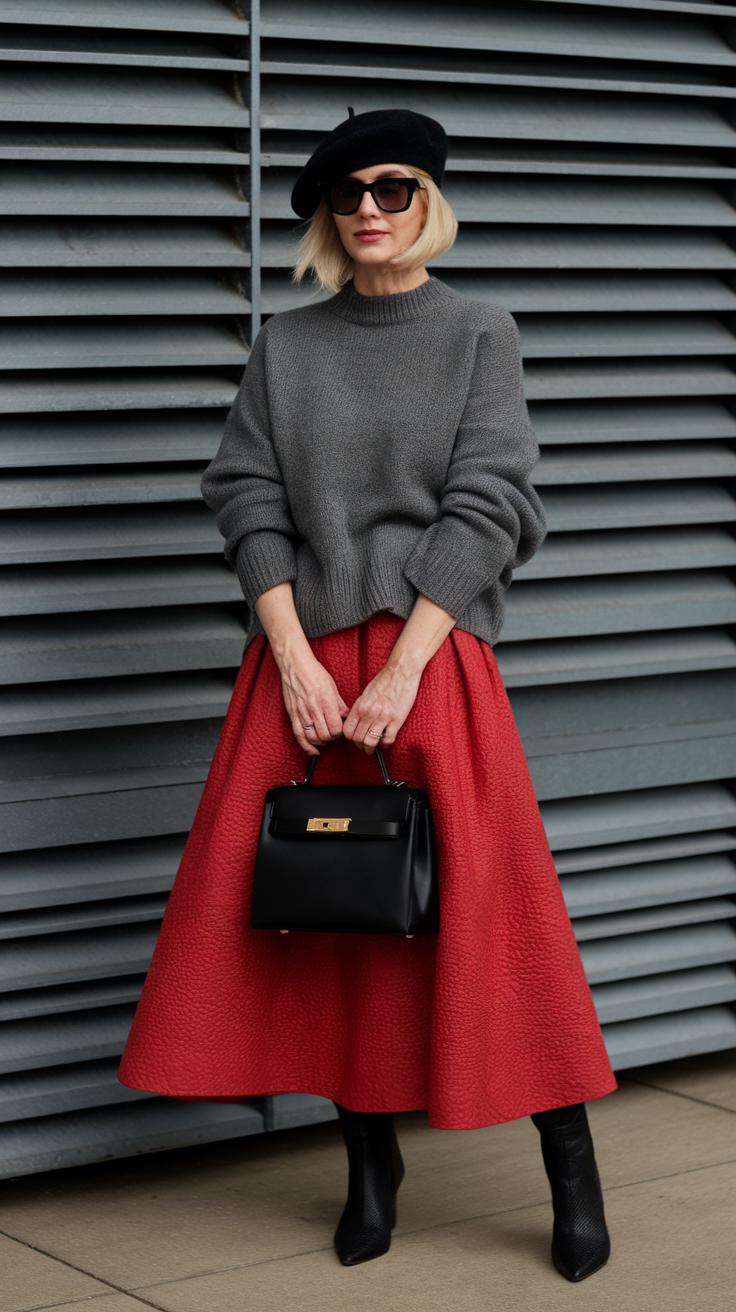 A cozy grey knit sweater is paired with a striking textured red midi skirt, creating a bold contrast. Accessories include a black beret, oversized sunglasses, and a structured black handbag, completing this chic Parisian-inspired look. The outfit is perfect for fashion trends for women seeking effortless elegance with a pop of color.