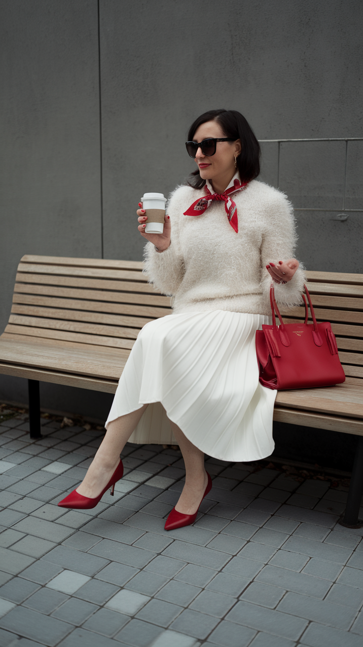 This ensemble features a soft white fuzzy sweater paired with a flowing pleated white midi skirt. Bright red accents, including pointed heels, a structured handbag, and a neck scarf, inject energy into the monochromatic base. This outfit showcases style for women blending texture and vibrant details for spring.