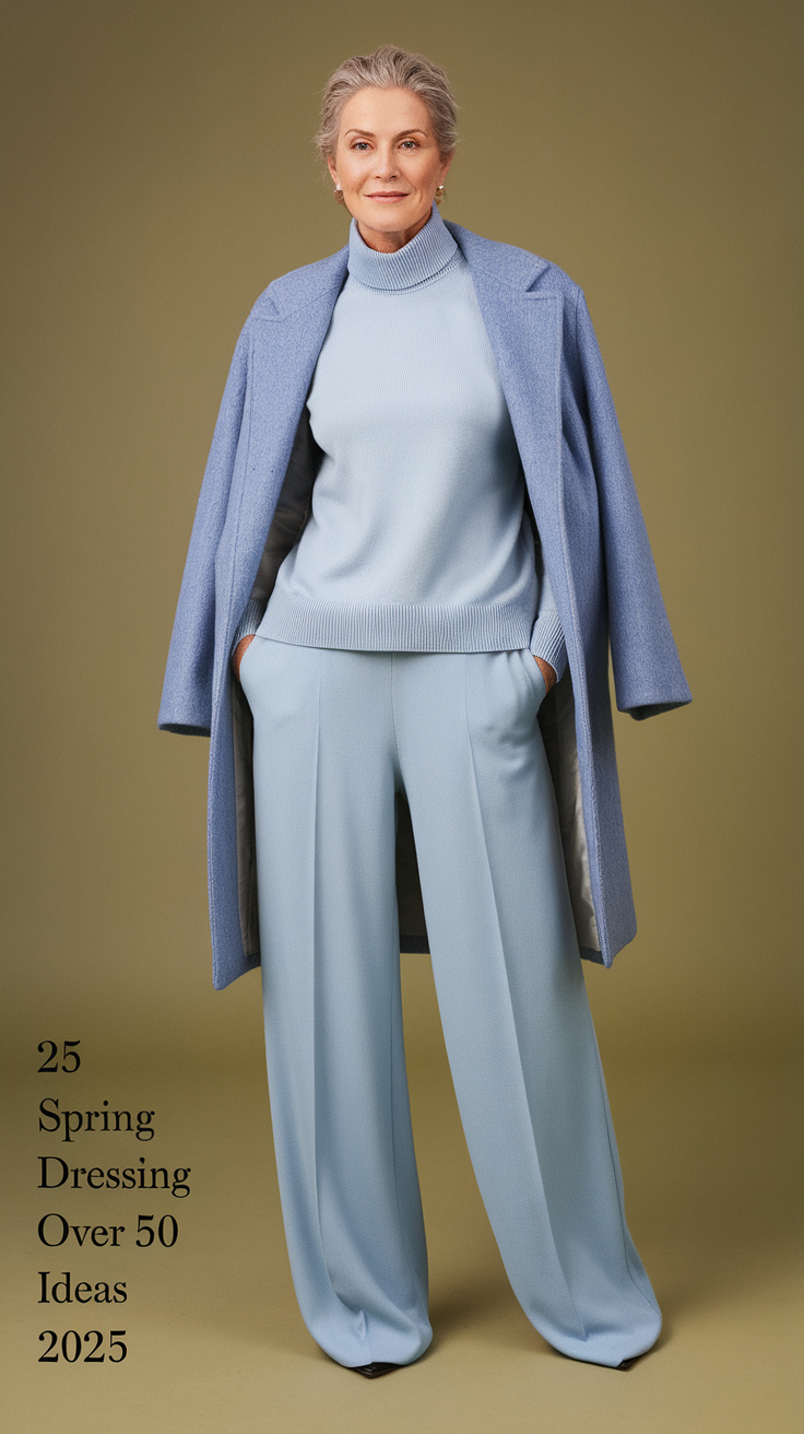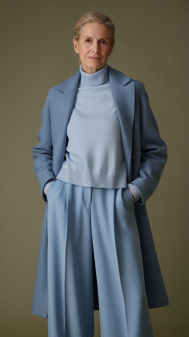 This look highlights a tailored blue coat layered over a soft turtleneck sweater and wide-leg trousers in matching tones. The structured fit contrasts with the relaxed knit for an effortlessly polished ensemble. Perfect for outfits over 50, this tonal look is both modern and versatile.