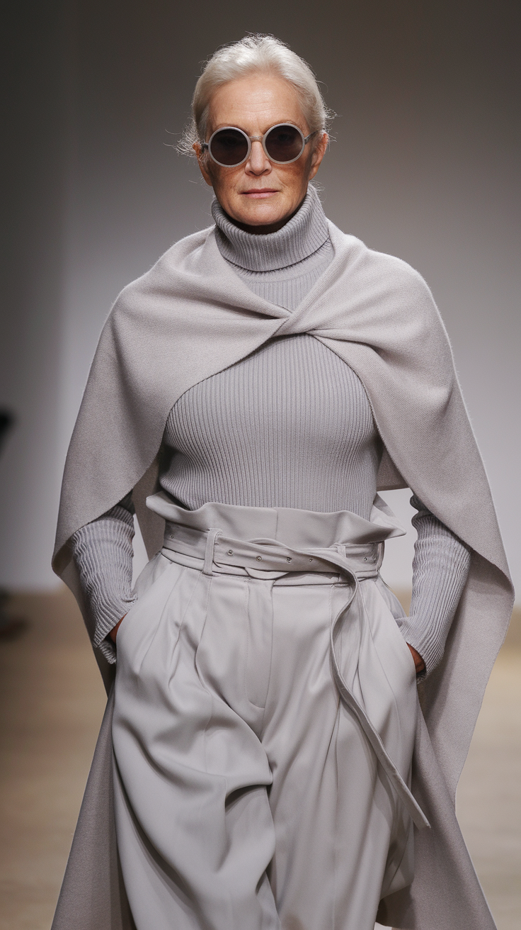 This look features a ribbed turtleneck paired with high-waisted pleated trousers in soft pastel gray. A draped cape adds a refined touch, creating a polished and cohesive outfit. Perfect for Spring Dressing Over 50 ideas 2025, it combines sophistication and comfort.