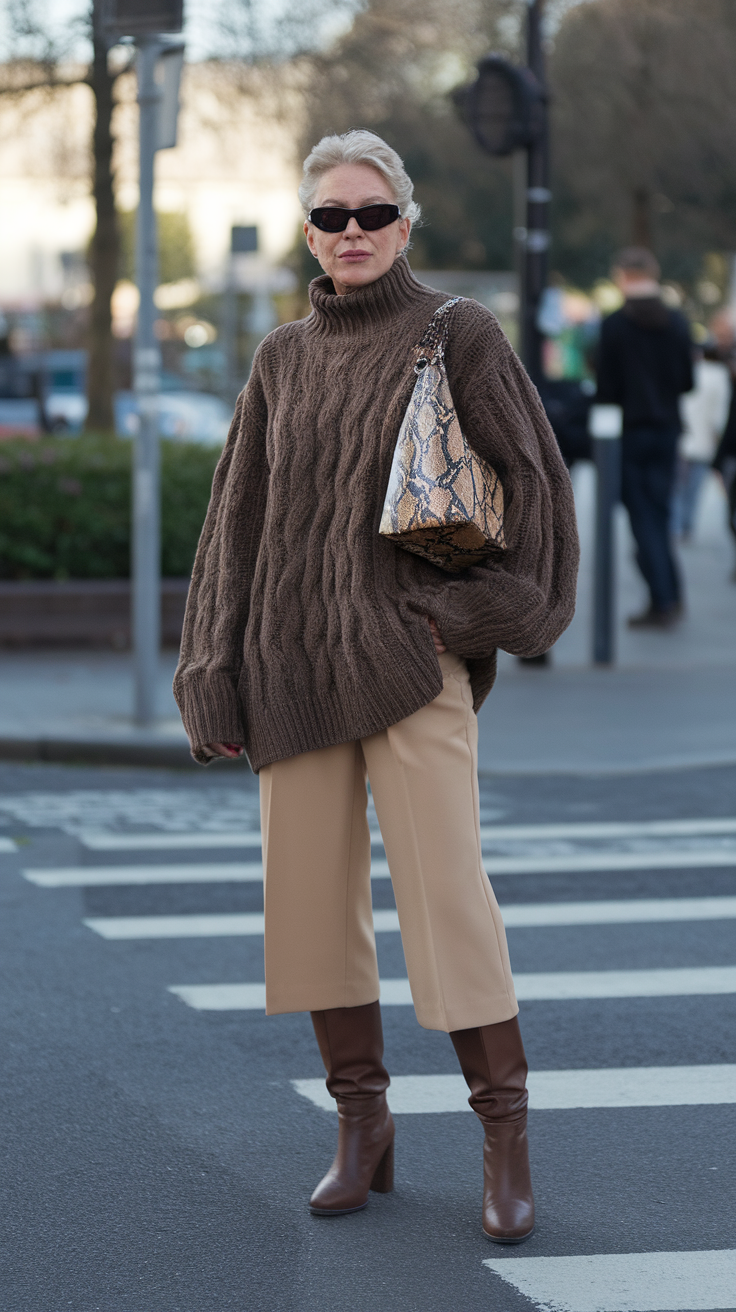 A cozy brown cable-knit sweater creates a warm yet fashionable statement, paired with beige cropped trousers. The tall brown boots and snakeskin bag provide a chic contrast, perfect for casual outfits women embracing texture and neutral tones.