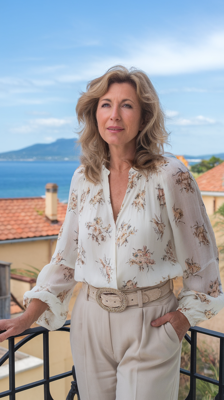 A delicate floral-print blouse with flowing sleeves is tucked into high-waisted beige trousers for a soft and feminine look. The textured belt adds a subtle accent, tying the outfit together with elegance. This ensemble is perfect for spring dressing over 50 ideas 2025, blending comfort and sophistication.
