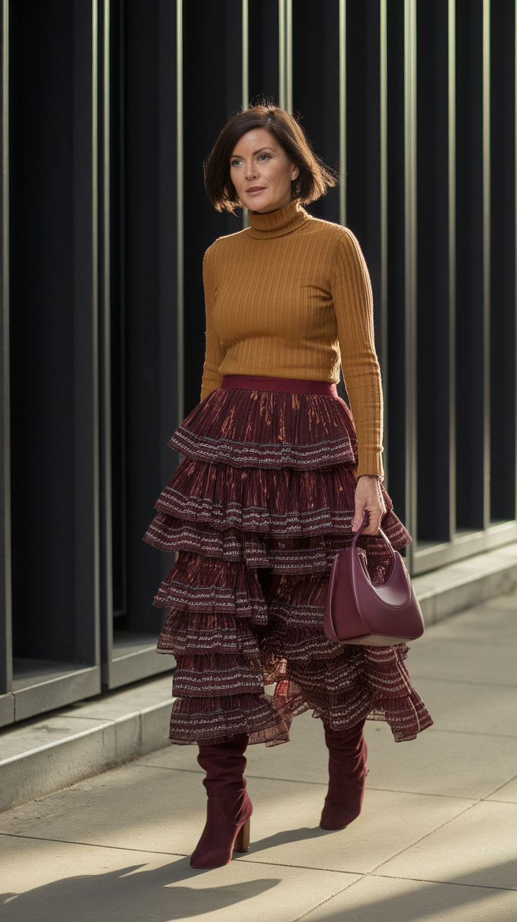 This outfit pairs a mustard ribbed turtleneck with a tiered, ruffled skirt in deep burgundy hues. Matching burgundy boots and a sleek handbag complete the look, offering a balance of texture and color. This is a standout example of spring outfits for women with bold layering and rich tones.