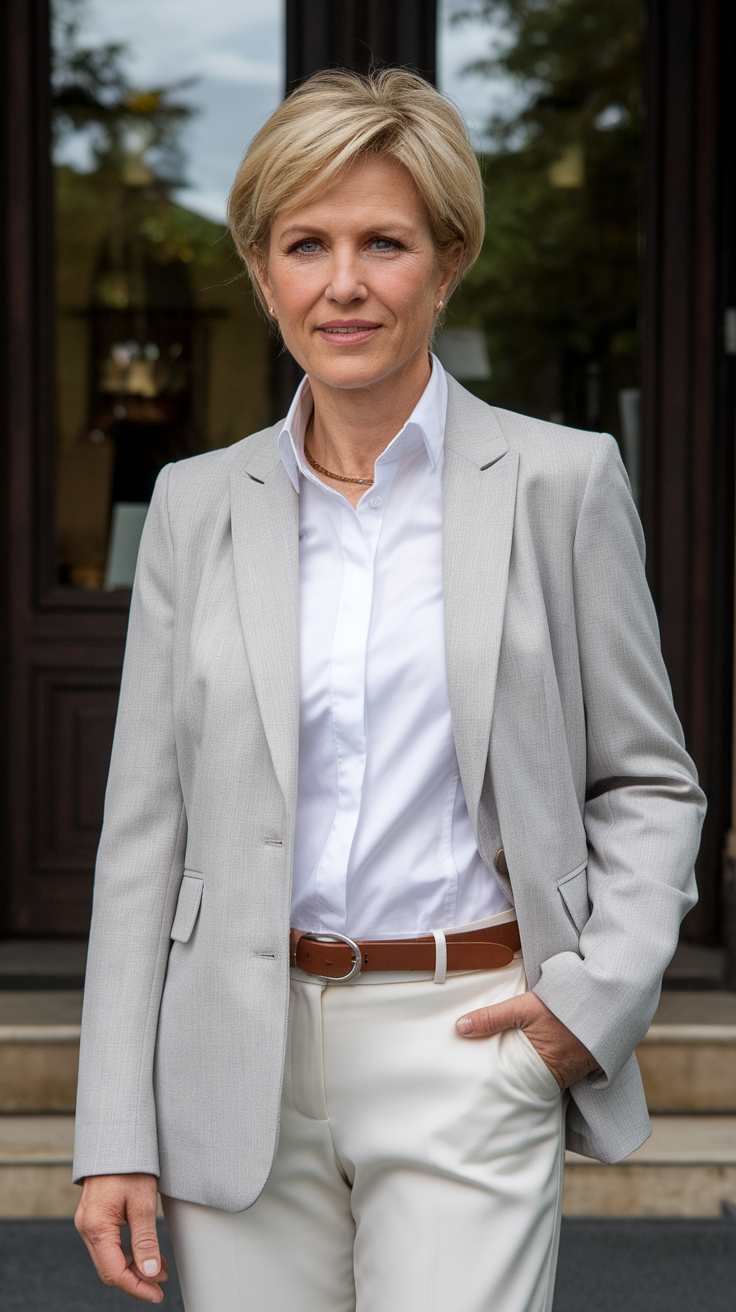 This ensemble combines a tailored light gray blazer with a crisp white shirt and ivory trousers. The brown leather belt adds a polished accent to the monochrome palette. Perfect for styles for women over 40, this look exudes effortless sophistication.