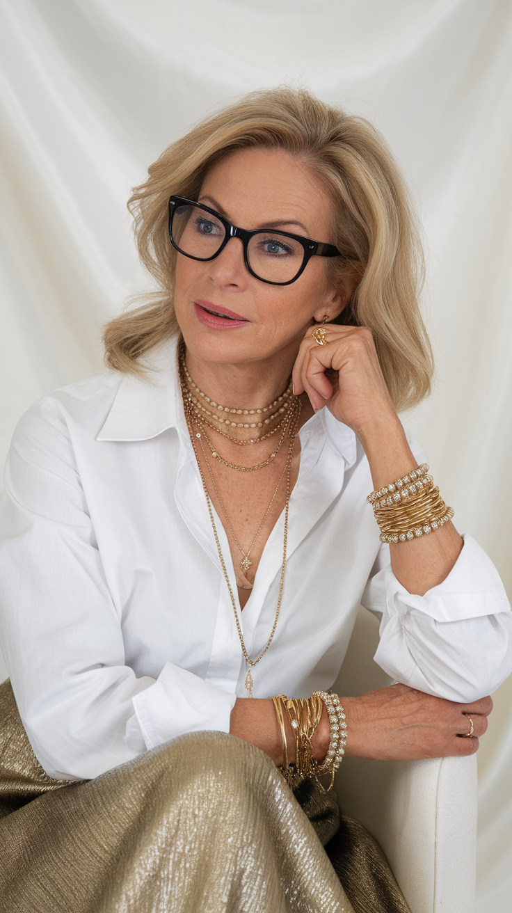 A crisp white button-down shirt is paired with a shimmering gold metallic maxi skirt, creating a balance of classic and bold. Layers of delicate gold necklaces and bracelets add sparkle and sophistication. This look is perfect for outfits for women embracing elegant evening styles.