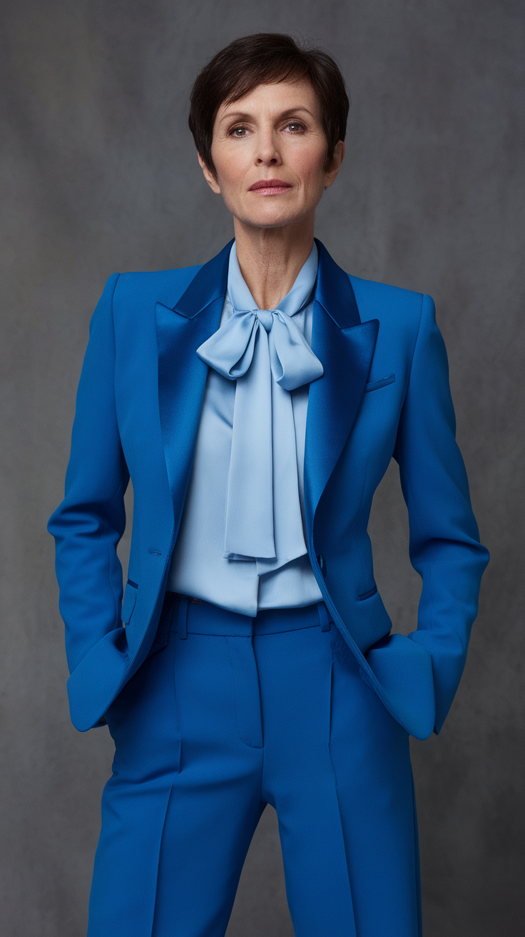 This vibrant blue suit includes a tailored blazer with satin lapels and matching trousers, paired with a bow-tie blouse in a lighter blue tone. The sharp silhouette and bold color make this outfit a standout example of 2025 fashion trends for women. Ideal for making a statement in professional or formal settings.