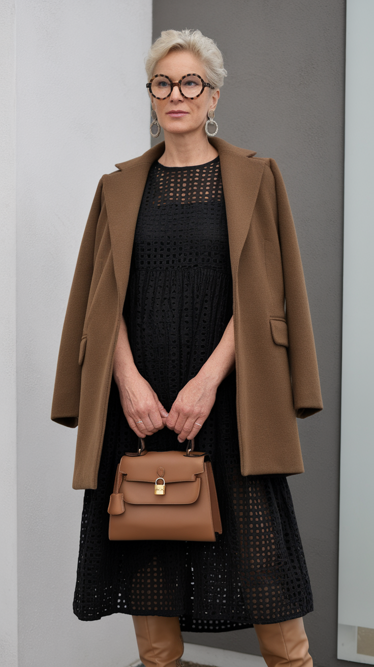 A black midi dress with intricate eyelet detailing is complemented by a structured camel coat for warmth and sophistication. Knee-high camel boots and a matching leather handbag complete this stylish look. This ensemble is a versatile choice for clothing styles for women transitioning between casual and formal.