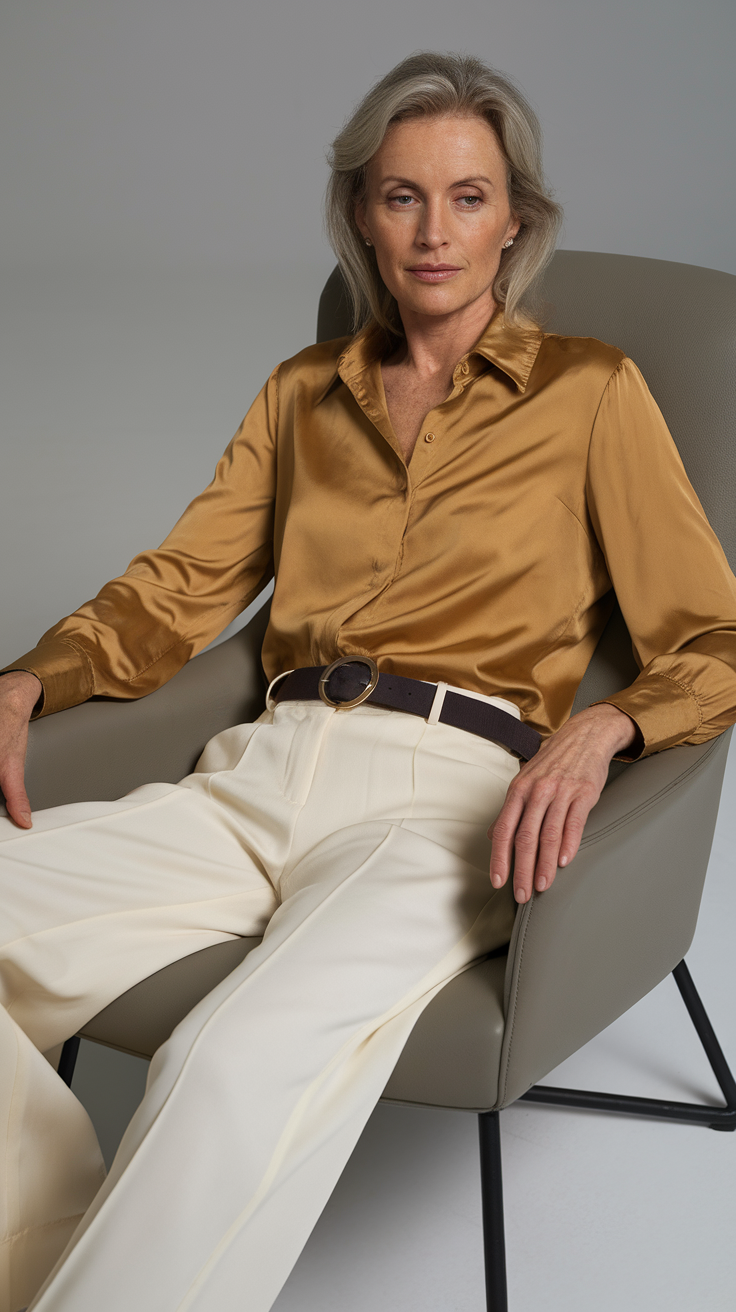 A luxurious gold satin blouse is paired with ivory wide-leg trousers for a timeless and chic outfit. A dark leather belt adds structure and refinement. This versatile ensemble highlights clothing styles for women, blending sophistication with comfort.