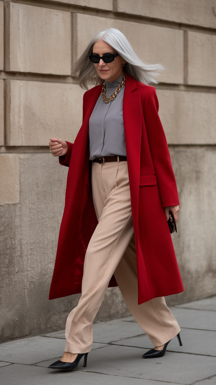 A striking red coat elevates this look, paired with beige tailored trousers for a balanced contrast. A soft gray blouse with a gold chain necklace adds sophistication and depth. This outfit exemplifies style over 50, perfect for both professional and casual spring outings.