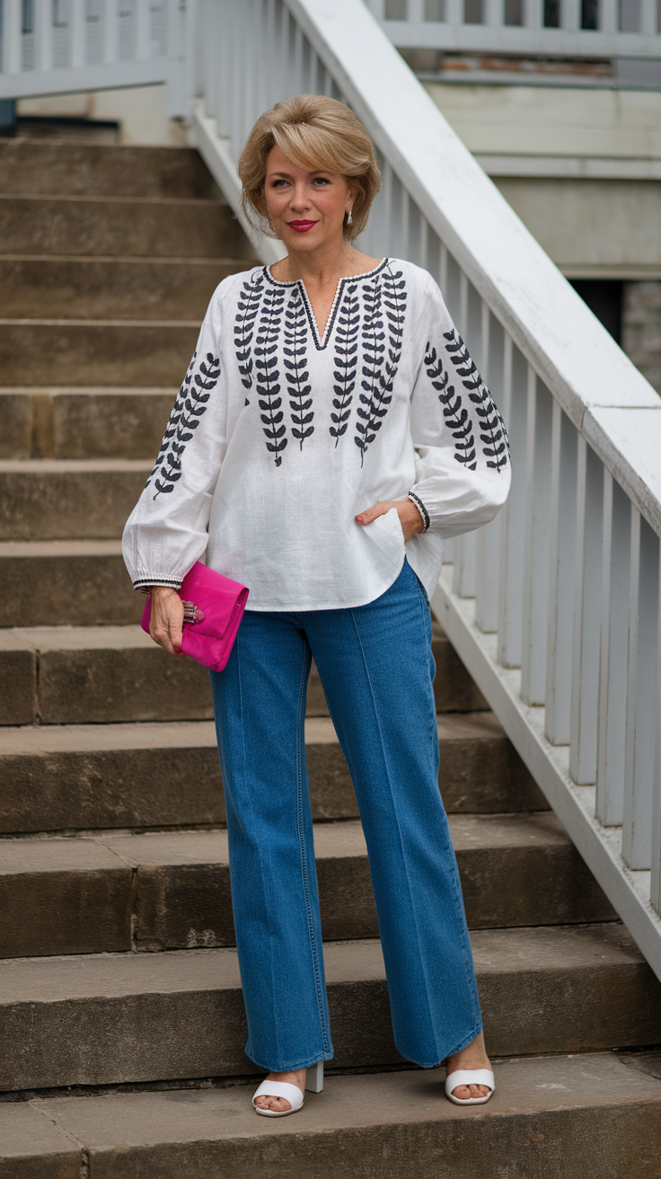 This outfit combines a loose white blouse with intricate black embroidery and classic straight-leg denim. The blouse’s flowing sleeves and bright pink clutch bring a playful element to the casual ensemble. It’s a versatile choice for casual outfits women or spring day events.