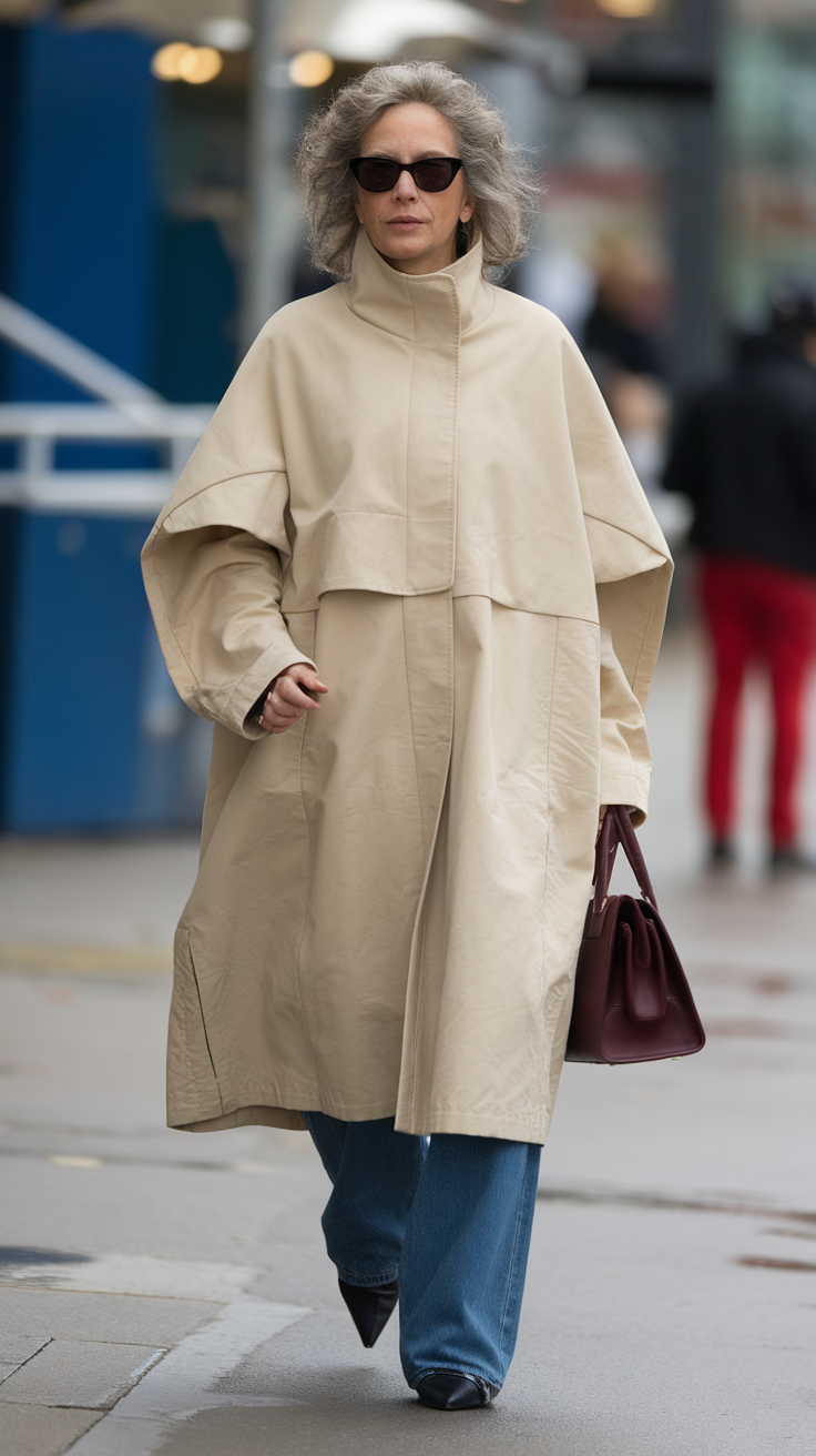 An oversized beige trench coat creates a relaxed yet stylish outerwear statement, paired with blue denim for a casual spring look. The pointed-toe black boots and maroon handbag add refined accents. This look is ideal for a travel wardrobe for women embracing 2025 trends.