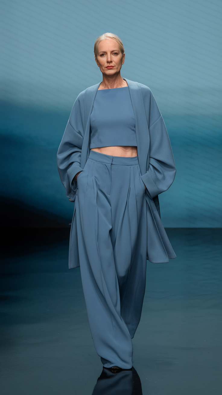 This outfit features a cropped top paired with high-waisted pleated trousers in a serene shade of blue. A matching oversized coat adds flow and elegance to the overall look. Perfect for fashion 2025 trends women, this monochromatic style is both modern and striking.