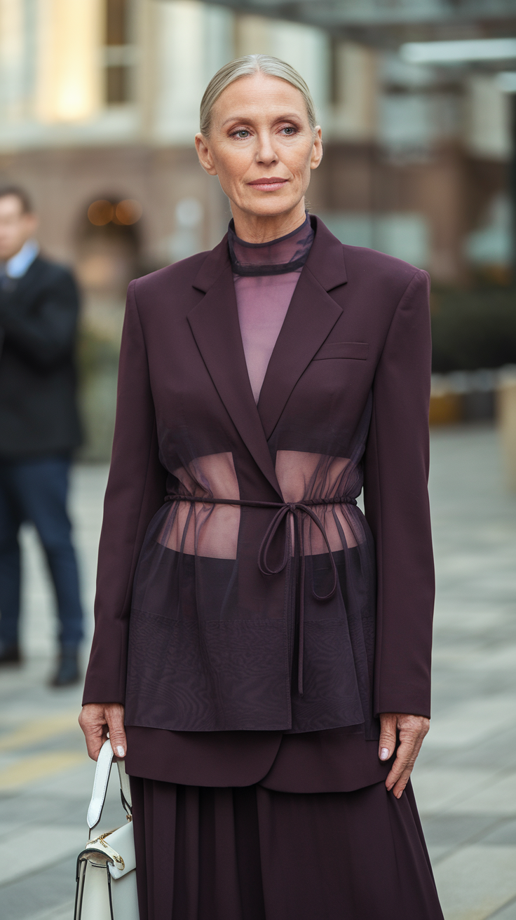 This deep plum blazer features sheer paneling and a cinched waist tie for a structured yet delicate silhouette. Paired with matching wide-leg trousers, it exudes bold elegance. A great example of outfits for women over 40, blending professional and creative elements seamlessly.