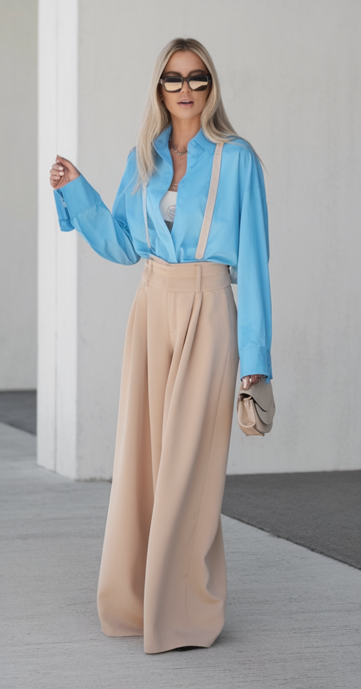 #16 Oversized Blue Shirt with Wide-Leg Beige Trousers