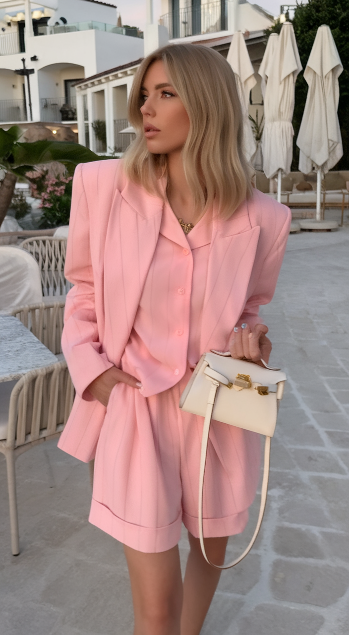 A chic Hawaii vacation or summer getaway calls for a soft pastel tailored set like this one. The lightweight blazer, structured yet relaxed, pairs effortlessly with matching high-waisted shorts and a classic button-up shirt. The creamy mini handbag adds sophistication, making this women casual outfit a polished yet relaxed staple in closet organization. The casual chic design makes it a must-have for versatile styling.