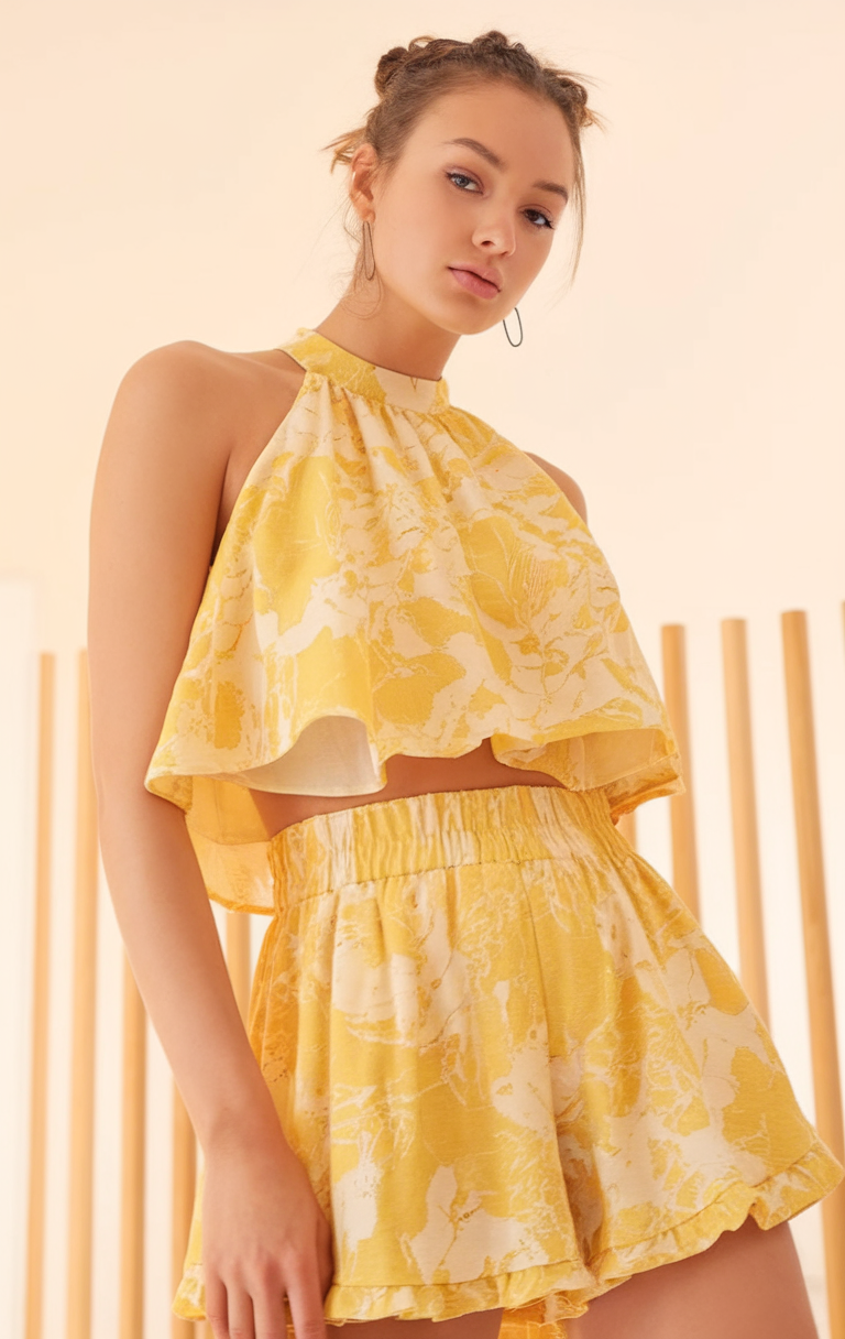 This breezy Hawaii vacation-inspired set is a must-have for any spring summer season capsule wardrobe ideas 2025 collection. The halter-style crop top features a flowy layered design, adding movement and ease to the outfit. The matching high-waisted shorts, with a subtle ruffled hem, create a lightweight and comfortable fit. The delicate floral print in pastel yellow keeps the look fresh, making it ideal for warm-weather days.