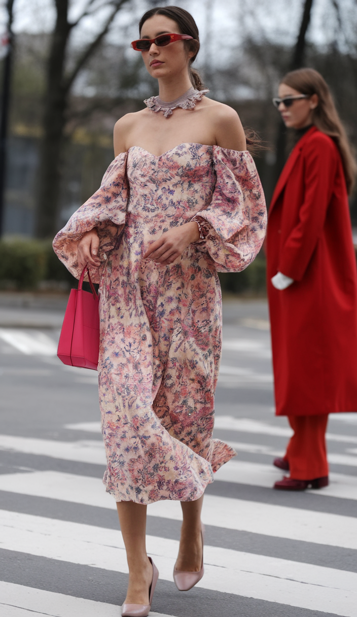 This minimal classic floral midi dress combines elegance and effortless styling. The off-the-shoulder design is complemented by voluminous puff sleeves, creating a soft and romantic look. The flowing silhouette, combined with pastel floral prints, captures the essence of casual chic styling. Paired with pointed-toe blush heels and a bold pink handbag, this 2025 outfit is a timeless option for city strolls or special occasions.