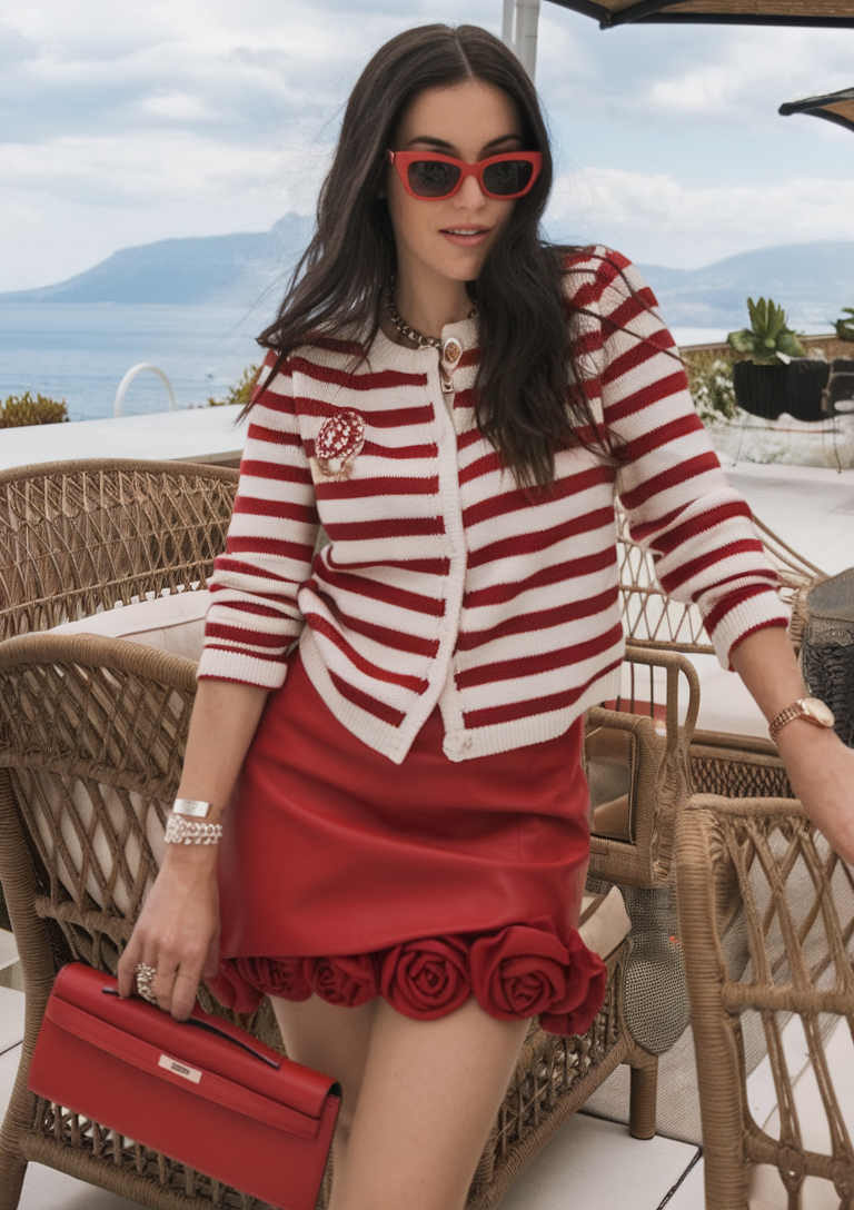 A timeless yet modern take on spring summer season capsule wardrobe ideas 2025, this outfit pairs a fitted striped cardigan with gold button details and a bold red leather mini skirt. The skirt features sculptural rose appliqués at the hem, adding a romantic touch to the 2025 outfit. A structured red clutch and matching sunglasses tie the look together, creating a sophisticated yet playful balance.