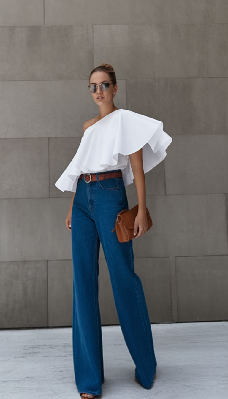 #4 One-Shoulder Ruffled White Top with Wide-Leg Denim