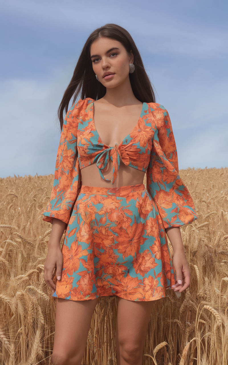 A vibrant choice for spring summer, this matching set features a long-sleeve crop top with a front tie detail and a high-waisted mini skirt. The bold floral pattern in orange and blue creates a striking contrast, perfect for a Hawaii vacation or a lively summer day. The lightweight fabric and flowy design keep this 2025 outfit fresh, balancing playful femininity with contemporary style.
