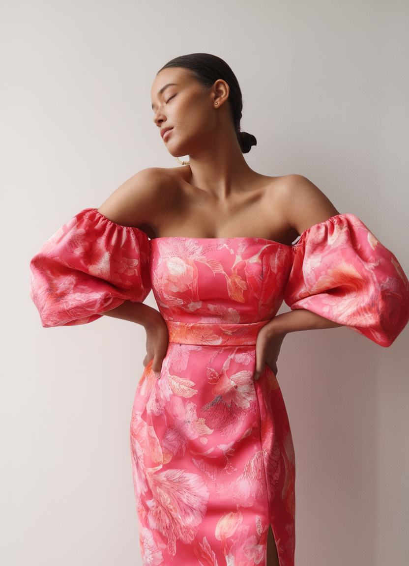 This striking off-the-shoulder dress in a bold coral hue is an elegant 2025 outfit choice. The fitted bodice is accentuated by voluminous puffed sleeves, adding a dramatic yet refined touch. The satin material and delicate floral pattern bring a sense of luxury to the spring summer aesthetic. A standout piece for evening events, this dress blends casual chic with timeless sophistication.
