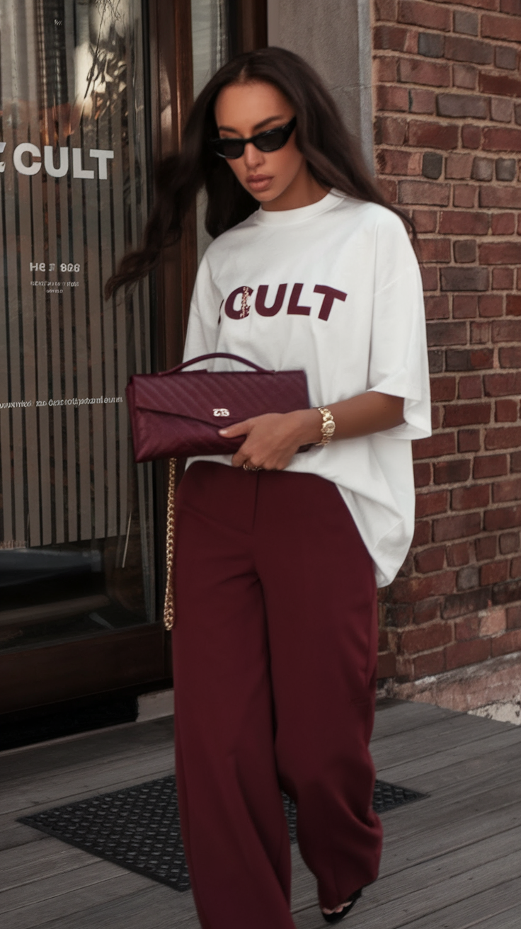 A relaxed women casual outfit, this look pairs an oversized white T-shirt with bold lettering and structured high-waisted burgundy trousers. The contrast between the casual top and tailored bottom creates a minimalist yet polished effect. Complemented by a quilted handbag in a matching shade, this outfit embodies effortless closet organization and city-ready style. This versatile look works well for both casual days and modern workwear.