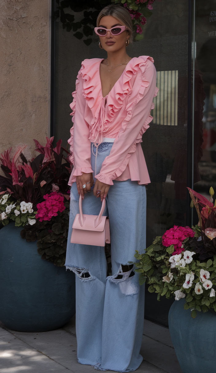 This minimalist yet stylish outfit blends romance and edge effortlessly. A soft pink blouse with dramatic ruffles and a lace-up front brings a spring summer charm, while the light-wash distressed wide-leg jeans offer a casual contrast. The pastel pink micro handbag and coordinating sunglasses create a cohesive 2025 outfit that fits perfectly into a Hawaii vacation or everyday wear. This combination is a perfect balance of elegance and relaxed fashion.