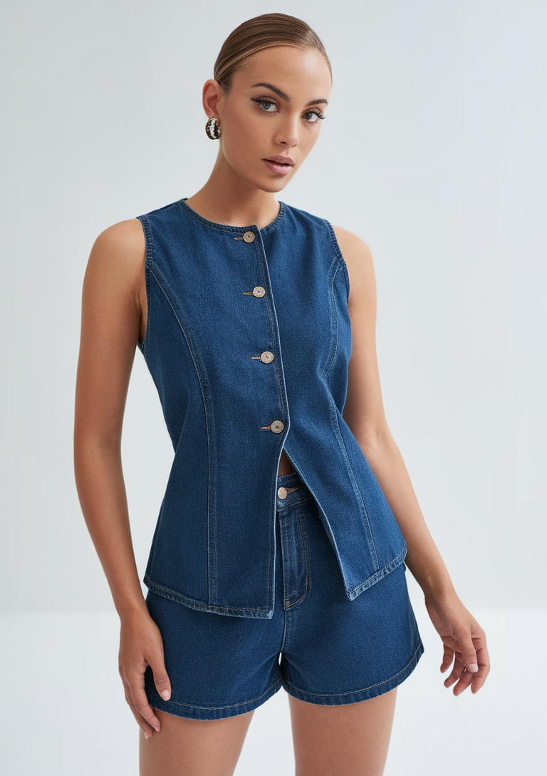 This sleeveless, button-up two-piece set features structured denim pants and a tailored top that pairs perfectly with high-rise shorts. The minimalist design and deep wash create a professional yet relaxed look that works well as a 2025 summer birthday outfit. The two-piece set presents an elegant women’s casual outfit perfect for relaxed family occasions and minimalist photo sessions. The sleeveless dark denim two-piece offers a snug fit that works for a variety of body types, especially teenage women who want a flexible look.
