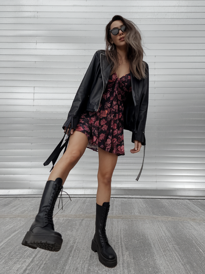 This outfit combines black and flame-red floral shorts with a versatile black leather jacket and high ankle lace-up platform boots. The pairing of soft prints with bold outerwear creates an edgy female baddie outfit that is ideal for both creative photo shoots and fun parties. The outfit stands out as an excellent choice for birthday attire in the summer of 2025, as it provides a fortified look suitable for 23rd and 25th birthday celebrations that make a bold statement. The shape of the outfit remains cute through the silhouette, but the boots add an intense finishing touch.