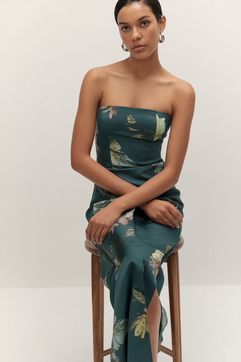 A strapless midi dress showcases deep teal satin characteristics through its delicate floral pattern along a thigh-high revealing slit. The formal structure of the fitted bodice with a straight neckline gives this dress an elegant sophistication that works well for family gatherings as well as formal birthday dinners at 18 or 24. The fabric moves with grace as it flatters all figures and effortlessly makes a refined statement. The dress is an excellent choice for women who want sophisticated outfits embellished with romantic designs.
