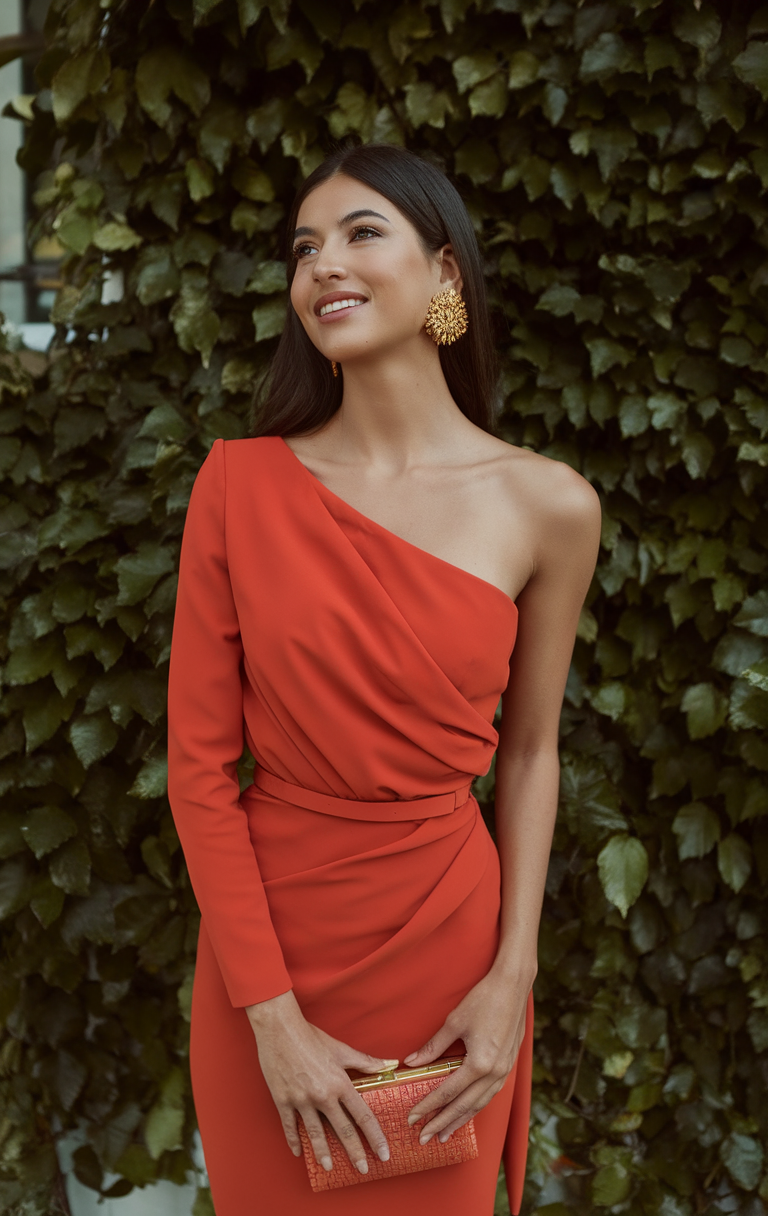 This red ensemble features a one-shoulder neckline and a figure-hugging drape at the bust with a secure belt at the waist. The flowing fabric creates a graceful look that transforms into a structured midi shape. This elegant piece is suitable for sophisticated family dinners as well as special 23rd and 25th birthday events and stylish photo shoots. This elegant outfit offers women ageless beauty in their choice of birthday attire in the summer of 2025.