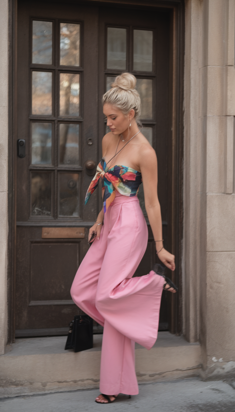 A bold outfit featuring a colorful scarf top with pink high-waisted pants is a fun and trendy combination. The outfit manages to combine cute elegance with edge, making it suitable for most occasions, from a 23rd birthday dinner with friends to a night out. Minimalist baddie and photoshoot styles benefit from this outfit design because it looks attractive on all body types. This outfit is also suitable for children’s outdoor events or picnics that require comfort elements.