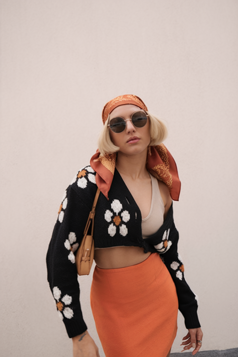 This outfit features black cardigans with large white daisies on the front and back paired with neutral crop tops. The bright orange skirt pairs nicely with the skirt to create a fashionable birthday ensemble for the summer of 2025. This outfit is perfect for casual gatherings as well as vintage-themed photo shoots and fun family reunions. Great for teens or women who love the badass style with a touch of retro flair.