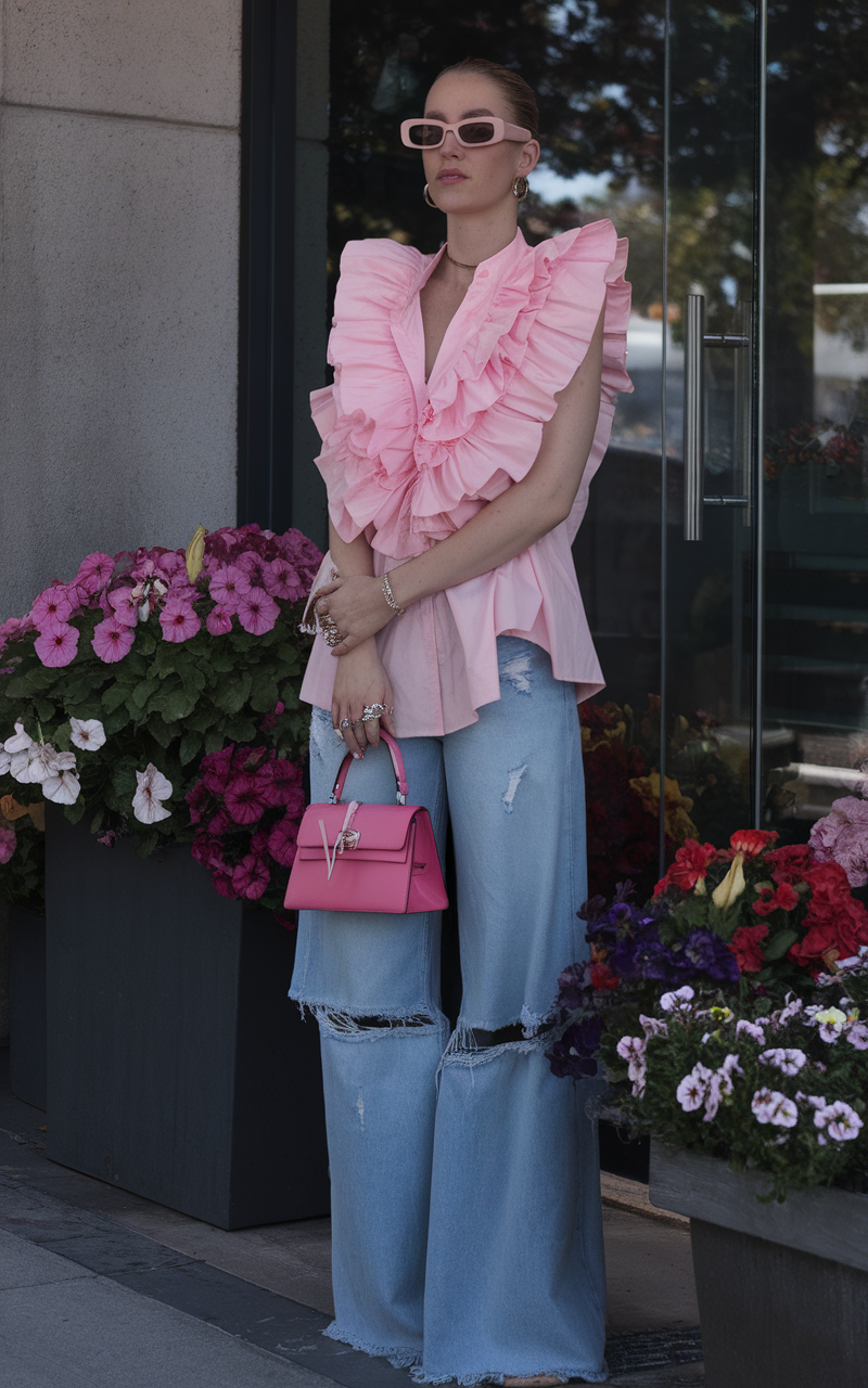 #5 Ruffled Pink Blouse with Ripped Wide Leg Jeans