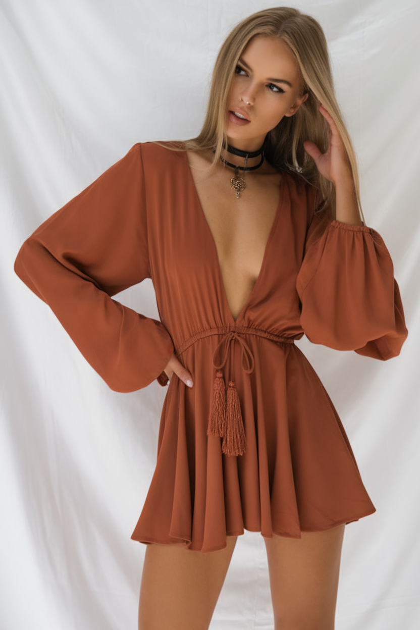 This lightweight romper features bishop sleeves, a scoop neck and tassels tied at the waist. This dress offers both relaxed comfort and seductive appeal with its flowing hem and rusty red color that flatters any body type. This outfit idea is perfect for a photo shoot, a 21st birthday party, or a summer get-together with your friends. The item serves women with baddie style needs who want effortless yet charming options.