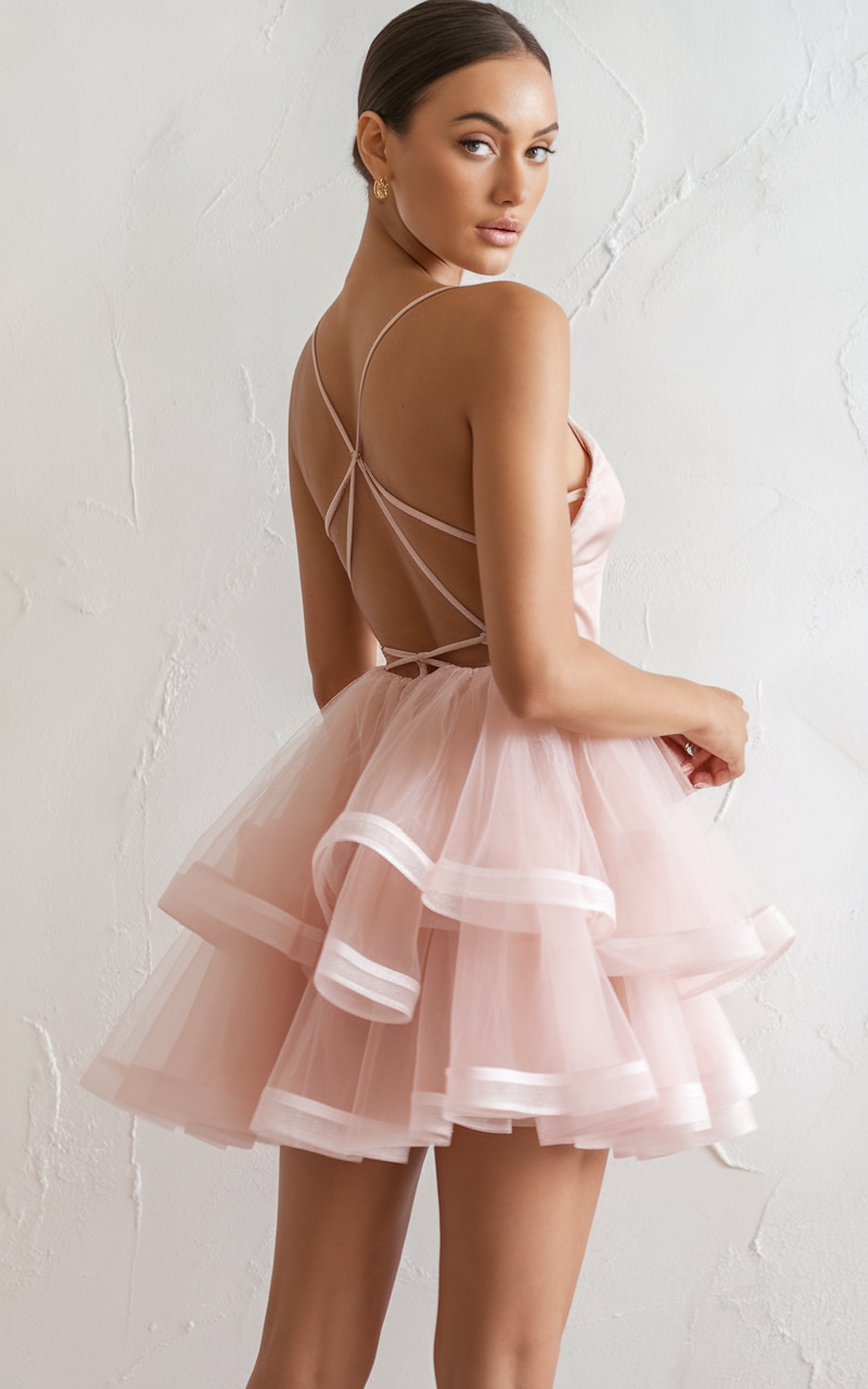 This mini dress design features dramatic layers of blush pink tulle accented with delicate satin trim and thin crossed straps at the back. This gown will be a standout choice for photos and events as its volume and elongated shape provide enough depth. This dress meets the style expectations of 18th or 25th birthday occasions because it delivers both elite class and a cute appearance. Fashionable women’s wear that offers a romantic and girlish outline for body-conscious styles.
