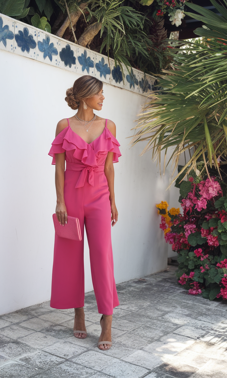The jumpsuit comes in hot pink with spaghetti straps along with cold shoulder details and an exaggerated ruffle neckline. A tie at the waist and wide leg design in this piece create a professional look that is equally at home at formal events and family gatherings. Simple yet fashionable clothing that blends sophisticated elegance with comfort serves as an excellent 23rd or 24th birthday choice, particularly suitable for women who choose sophistication without sacrificing comfort. A great choice for summer 2025 birthday outfit ideas that feel bold and sophisticated.