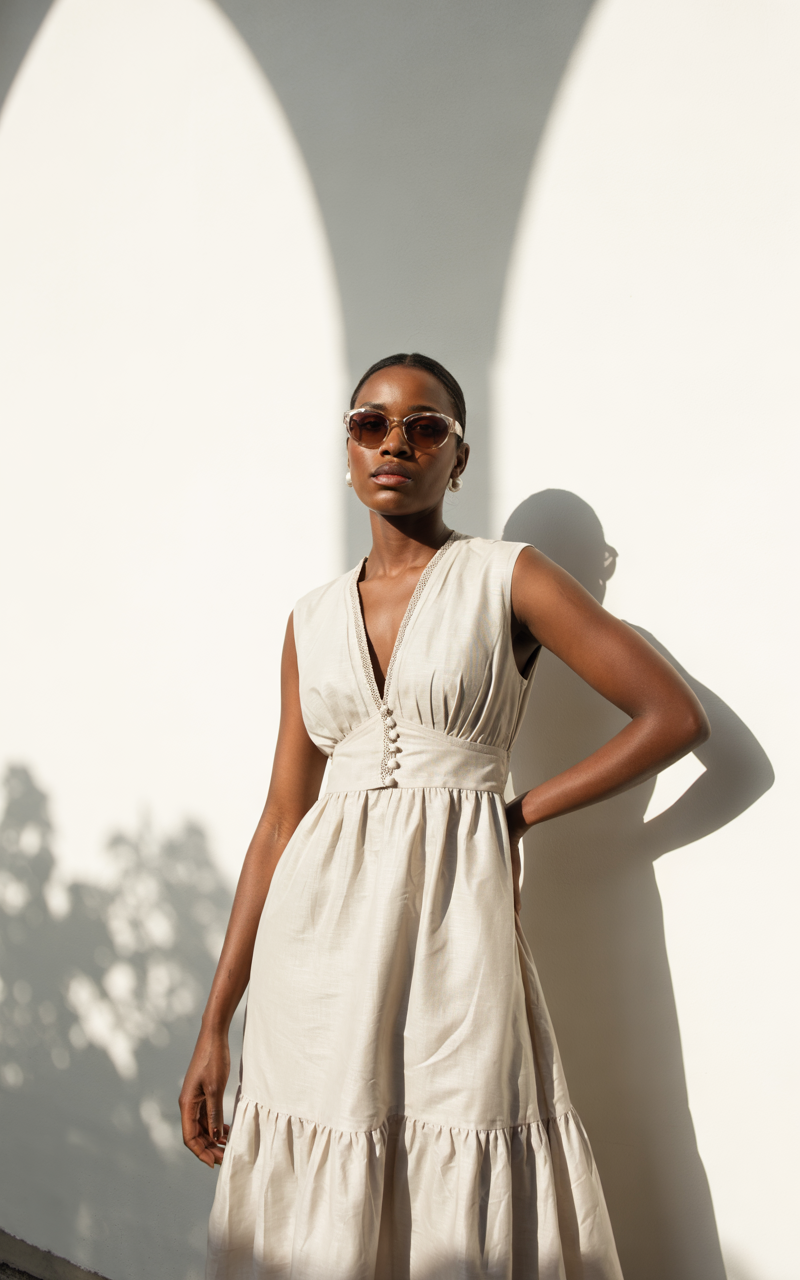 The sleeveless maxi dress features a casual gray and beige color scheme that creates a sophisticated summer outfit. The fitted bodice and subtle button detailing create shape while maintaining an airy essence to the design. The weight of this garment is appropriate for hot summer days, allowing for both relaxed comfort and effortless elegance. The sleeveless white button dress from 2025 works well as a summer street or casual office ensemble for African American women.