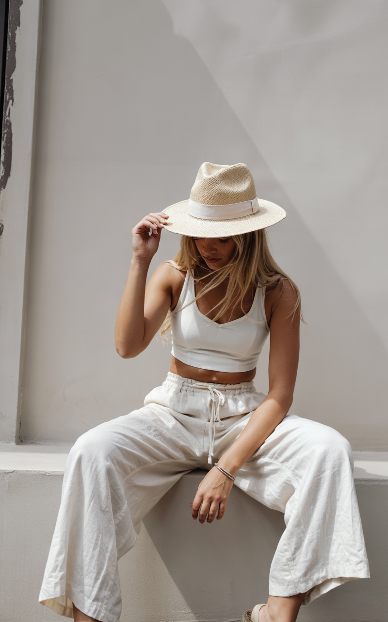 A relaxed summer ensemble consists of an off-the-shoulder tank with drawstring pants in a delicate white cotton fabric. The relaxed white outfit, consisting of a short-sleeved tank and wide-legged pants, offers effortless comfort along with breathability for hot days or short endeavors. The outfit serves a dual purpose, offering both relaxation and fashion-forward appeal. The outfit provides an excellent blend of modern fashion sense and comfort-oriented design.