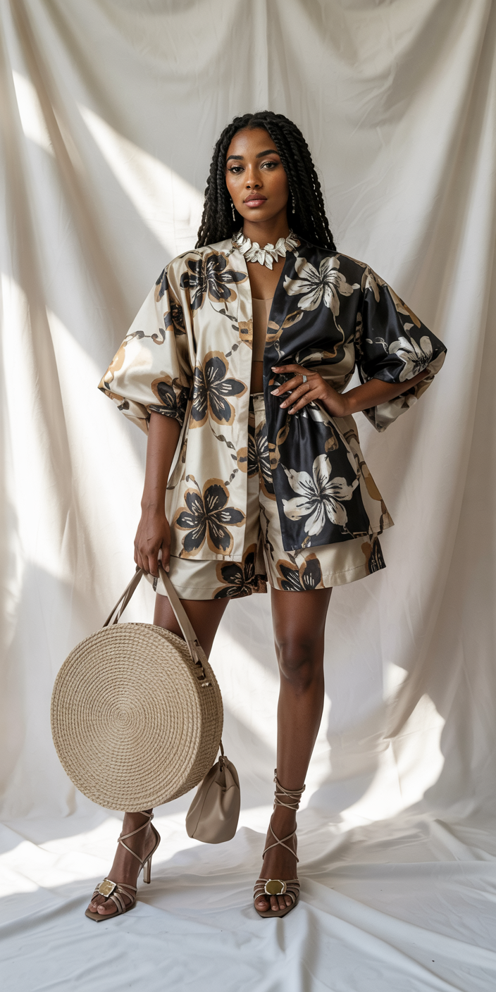 A floral mini dress remains a romantic seasonal garment for black women in 2025. The oversized balloon sleeves and bold brown belt provide an elegant contrast to the delicate colorful fabric. The outfit is trendy and fashionable, suitable for brunches as well as weekend social events. Hot weather is no obstacle for this outfit as the balanced cut of the flared skirt and soft fit provides both temperature comfort and style expression.