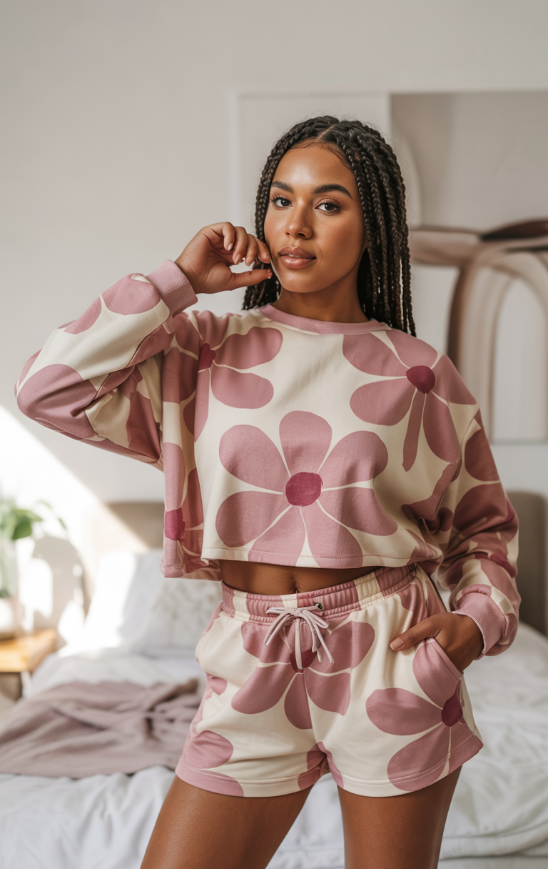 The oversized, cropped sweatshirt and drawstring shorts are made up of two pieces adorned with large pink floral prints. This modern structure of the casual match combines comfort with trendy appeal through its relaxed design and eye-catching pattern. This sporty summer outfit works perfectly as both loungewear and everyday wear, making it attractive to Black women in 2025. The item stands out as an excellent option for those looking for stylish loungewear that stands out.