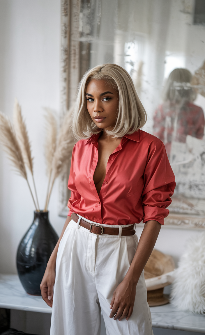 This ensemble features a fashionable coral satin blouse paired with white high-waisted pants. The top adds a pop of color and shine to the outfit, while the trousers maintain a clean look with a defined shape. The combination dresses elegantly while staying trendy in a contemporary interpretation of business casual. A versatile summer fashion outfit for the Black woman of 2025, ideal for both work and stylish daytime plans.