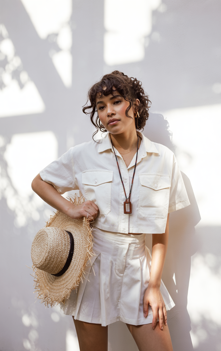 The outfit consists of a cropped button-up shirt with pockets that pairs beautifully with a pleated mini skirt at the waist. The design features simple structured playful elements making it suitable for street and casual settings. This coordinated ensemble offers an excellent combination of modern style with fresh and trendy elements and striking beauty during summer heat waves. The style combination presents a perfect balance between modern simplicity and a vibrant youthful look.