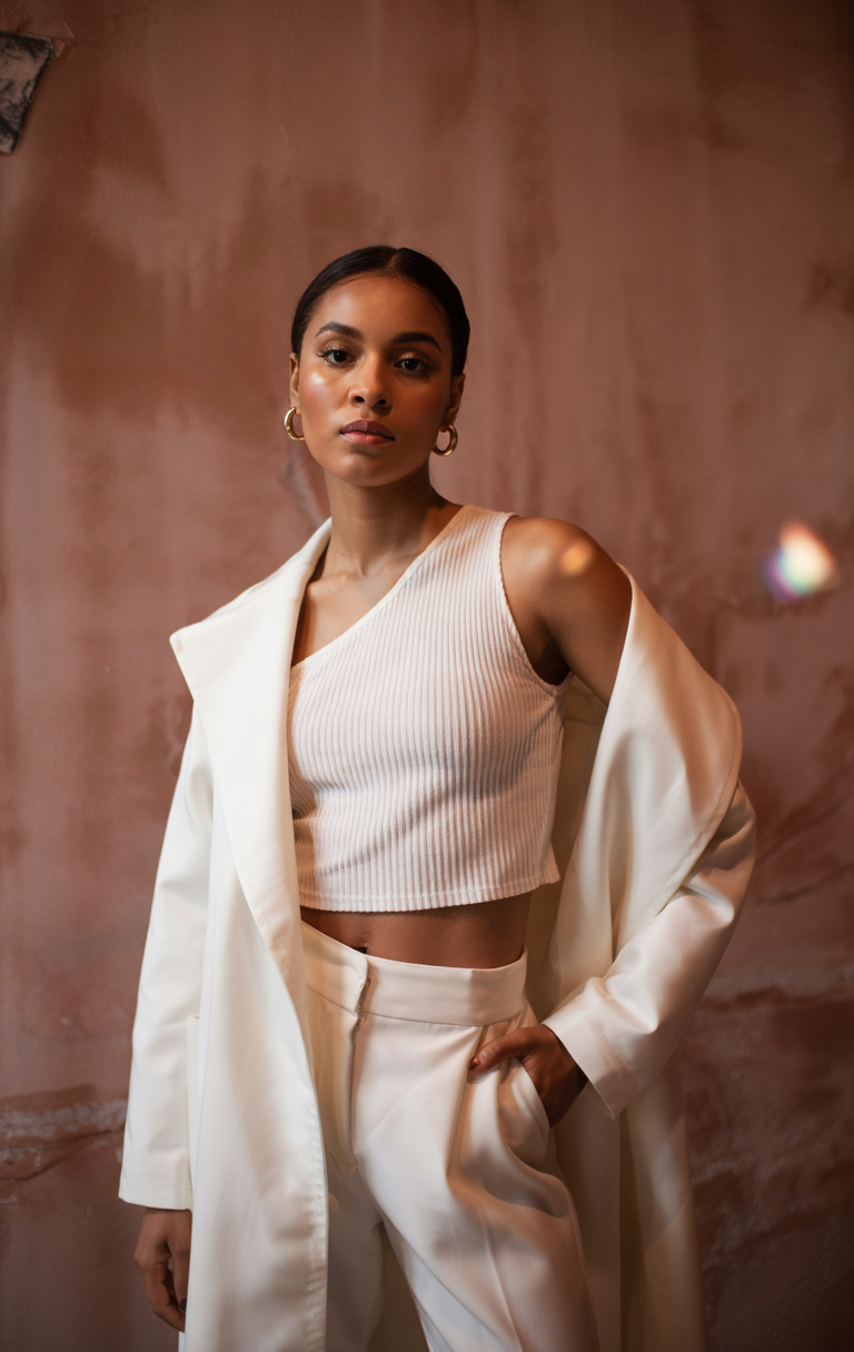 A recent ensemble features a ribbed, one-shoulder crop top paired with tailored white pants under a smooth, matching coat. This combination defines a neat shape that meets professional casual needs, yet works well for formal social gatherings. The outfit is effective because of its monochromatic design, which creates a fashionable appeal. This outfit presents a powerful and optimistic interpretation of summer fashion trends for women of color in 2025.