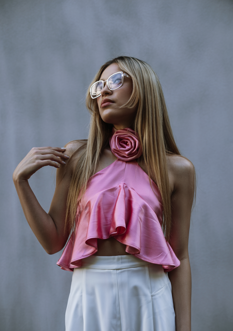 This stylish halter top offers a dramatic look with shimmering pink fabric embellished with statement ruffles along with a distinctive rose detail at the neckline. The top’s voluminous pleated skirt enhances the look when paired with white, high-waisted pants. This fashionable statement piece effortlessly enhances all hot summer outfits that demand attention. People can wear this outfit during evening affairs and upscale casual social outings.
