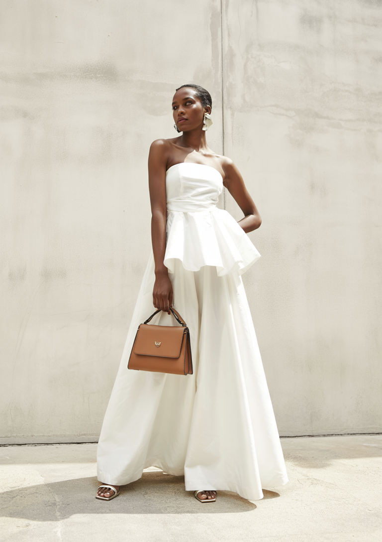 A clean and fashionable strapless jumpsuit look in a crisp white design is effective for formal summer ceremonies. This outfit maintains its trendy appeal through the structure of the peplum waist and wide-leg trouser design that works well for people of all sizes. The ensemble presents itself as both visually striking and elegant through its execution of quality elements that are both fun and sophisticated. The outfit represents a major highlight in the collection of season-appropriate fashionable apparel.