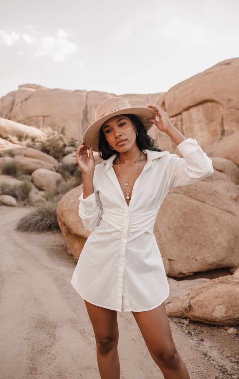 #7 Ruffled Shirt Dress with Long Sleeves and Wide Brim Hat