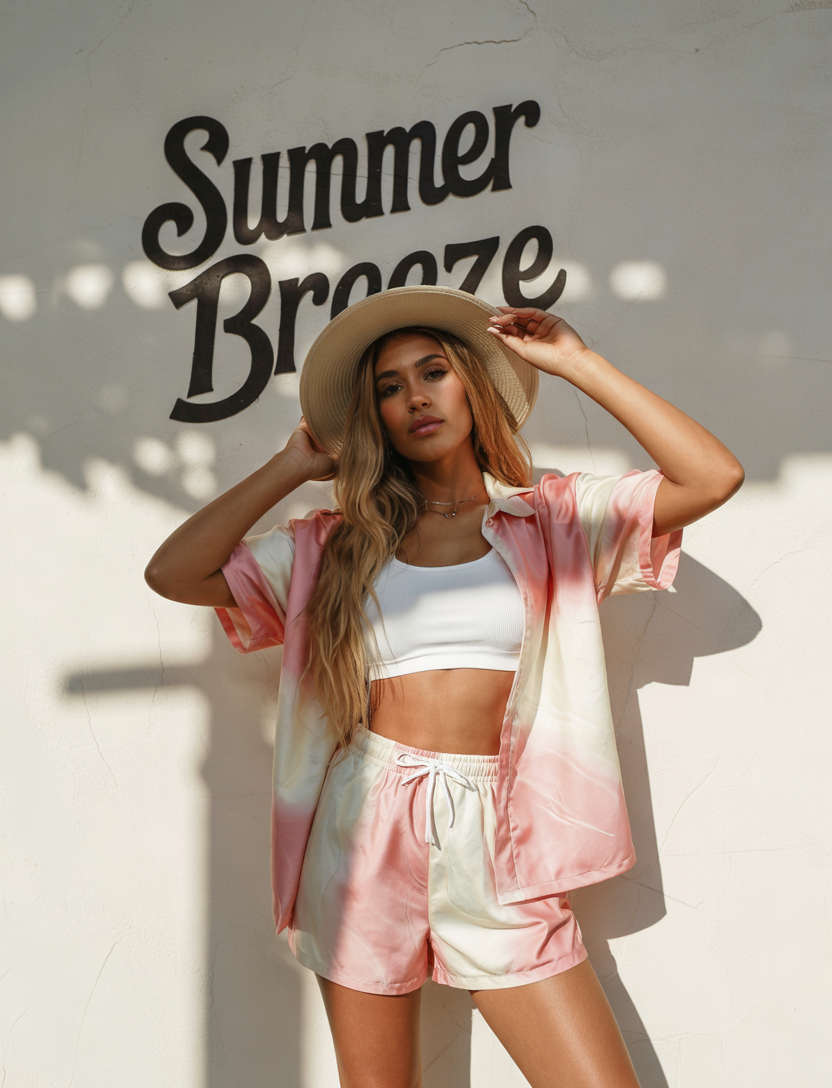 This outfit features ombre pink and cream garments arranged as a casual button-up top and elastic drawstring bottom matching set. The outfit is paired with a white ribbed top for a summery look that is sporty with trendy features. The outfit is made of a lightweight fabric that allows for relaxed beach activities and casual walks. A youthful piece in the latest loungewear inspired collections.