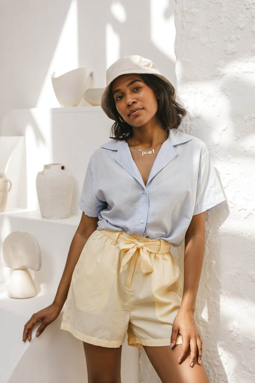 This outfit consists of a pair of normally pleated, lemon-yellow paper bag shorts paired with a short-sleeved, breezy shirt made of soft pastel blue fabric that is tucked inside. Padding near the waistband creates a neat and fashionable silhouette. The outfit works well for everyday activities, from walking down the street to enjoying casual summertime. This ensemble represents carefree yet elegant summer style. A great everyday summer fashion outfit for black women 2025.